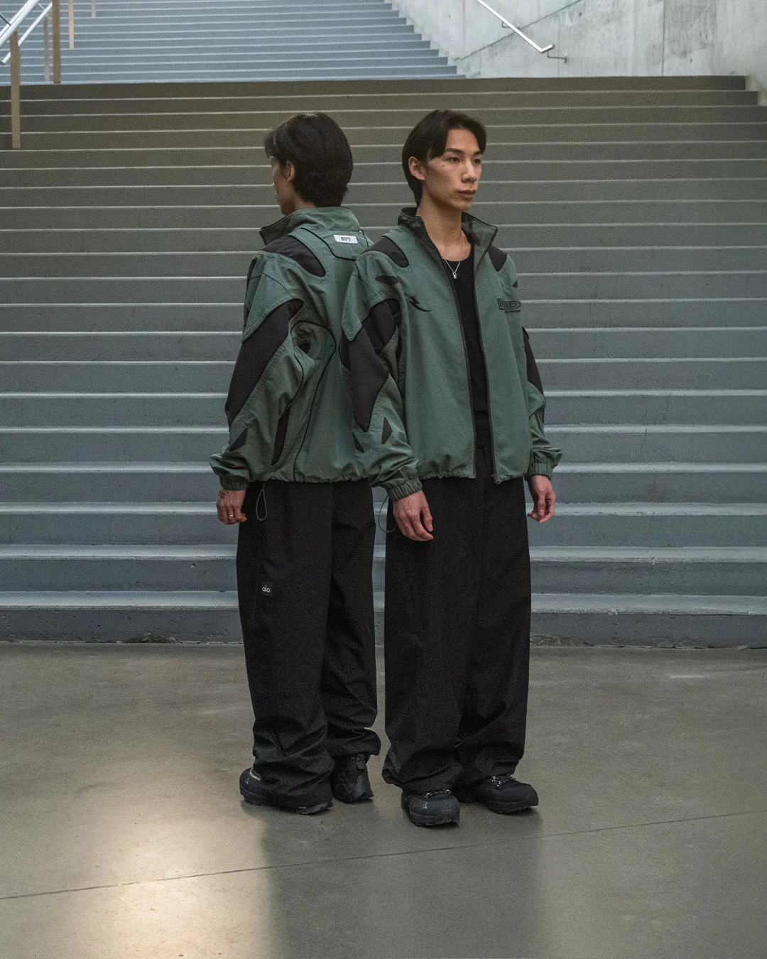 > 100% NYLON FABRIC (2-TONE DARK GREY/MINERAL GREEN) — NOTE: NECK TAG ERROR SHOWS 100% COTTON.