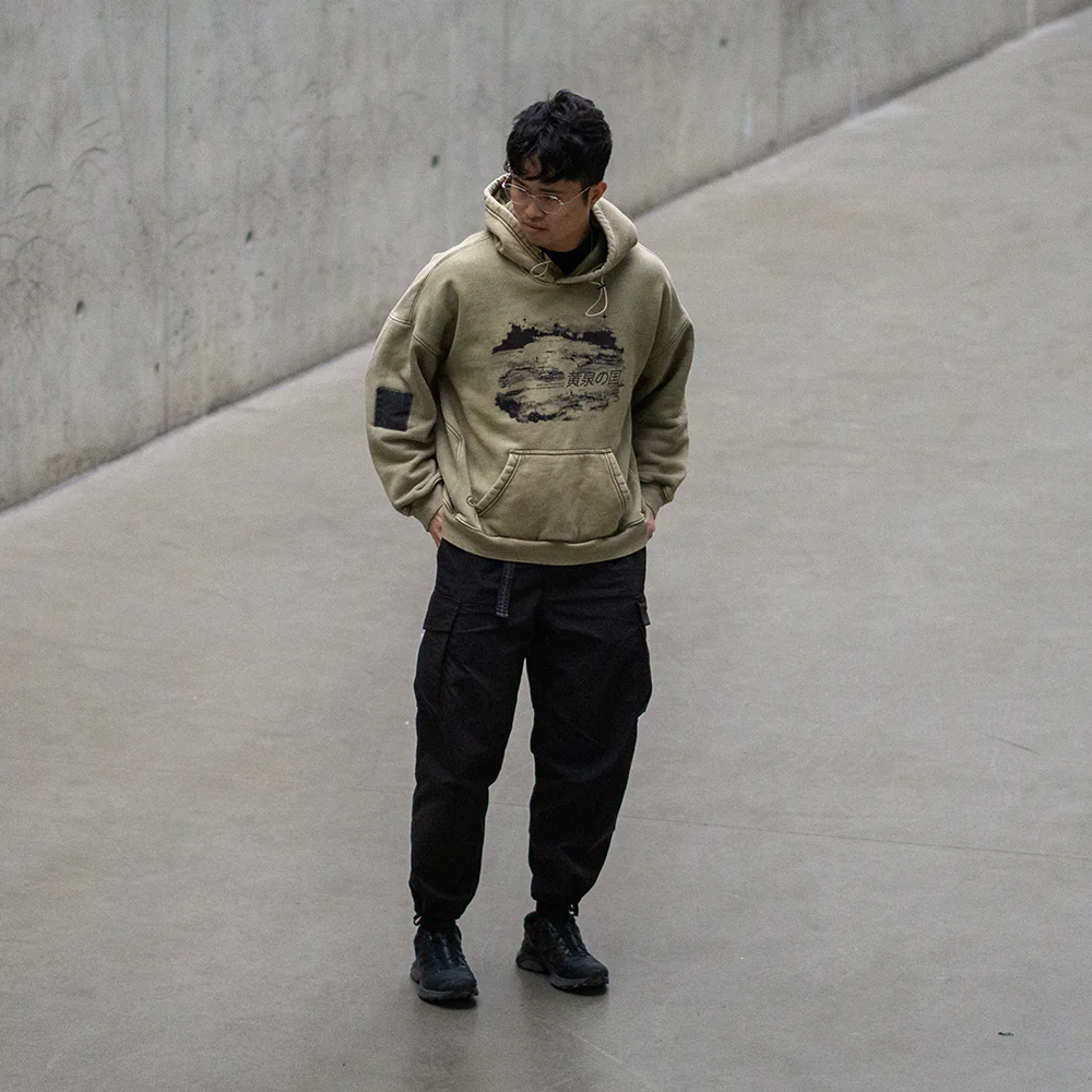 "The Japanese text roughly translate to "The Realm of the Dead". The Hoodie graphic is based on my personal visual idea on what the Afterlife looks like. It is a very abstract graphic and that the farther away you are, the more of the details become clearer. You might ask what you are looking at.. but that will always be based on your own idea of the Afterlife."